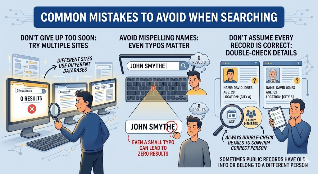 One big mistake in a fast people search is giving up too soon. If the first site doesn’t find them, try another one. Different sites use different databases. Another mistake is misspelling the person’s name. Even a small typo can lead to zero results. Also, don’t assume every record is 100% correct. Sometimes public records have old information or belong to a different person with the same name. Always double-check the details, like their age or family members, to make sure you found the right person.