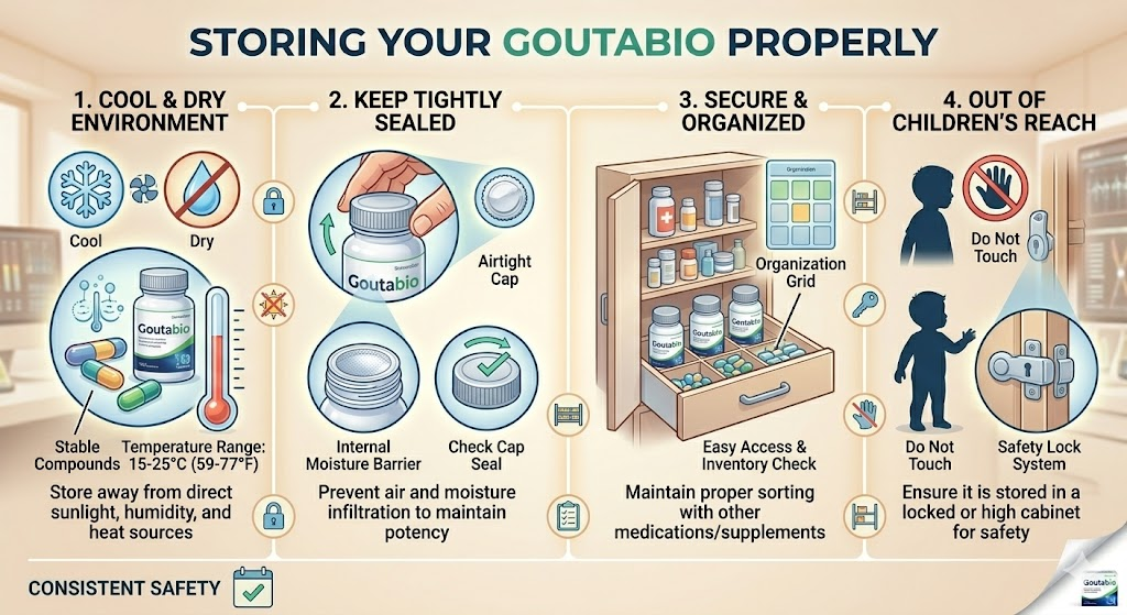 To keep your capsules fresh and powerful, you need to store your Goutabio correctly. Keep the bottle in a cool, dry place away from direct sunlight, like a kitchen cabinet. Heat and moisture can break down the natural ingredients inside Goutabio, making them less effective over time. Always make sure the lid is tight after you take your daily dose. If you travel, keep your Goutabio in its original container so you don’t forget the instructions. Proper storage ensures that every single capsule gives you the full benefit of its herbal blend.