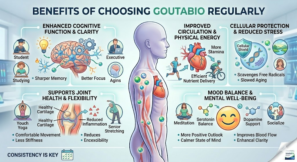 During the first week of taking Goutabio, you might not feel a huge change right away. Your body is busy absorbing the nutrients and starting the cleaning process. By week two of using Goutabio, many users notice that their joints don’t “click” or ache as much when they wake up. By the end of the month, the consistent use of Goutabio usually results in much better flexibility. It is a slow and steady journey rather than an overnight miracle. Patience is key when working with natural remedies like Goutabio, but the results are often worth the wait for many.